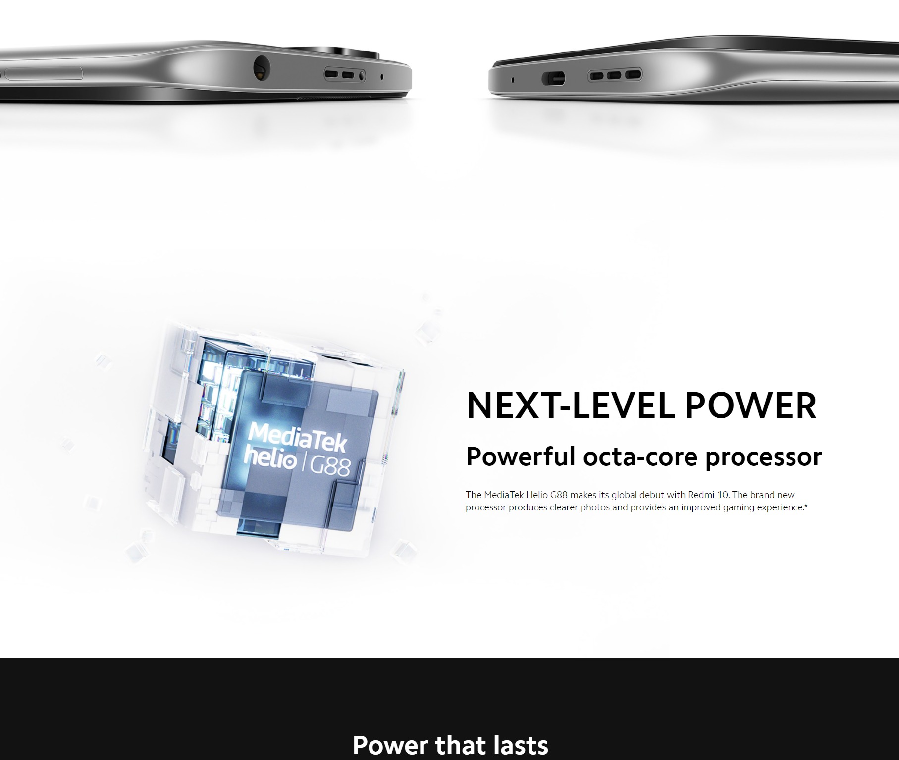 • MediaTek Helio G88 · 12nm process technology · Octa-core CPU 2x Arm Cortex-A75 @ Up to 2.0GHz 6x Arm Cortex-A55 @ Up to 1.8GHz · Mali-G52 MC2